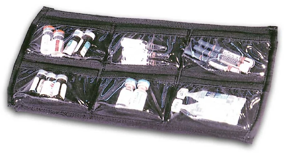 This little powerhouse is a great choice for organizing any small items, such as amps or vials. The Mini-med has six clear vinyl pockets, securely elasticized at the top. The shape of each pocket cradles amps and vials well. The back is armored with Corex plastic to keep your meds safe. The Mini-med attaches to any Velcro loop surface.