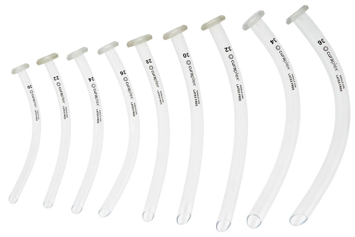Curaplex PVC Nasopharyngeal Airways are designed for the effective management of nasal airways, while providing patient comfort. Each kit comes with 9 different size airways. The airways are made of soft PVC. They have a beveled tip with an interior striation for smooth suction and easy catheter insertion. They also have a trumpet for secure placement. Each airway is packaged individually and has a color-coded label to clearly denote French sizing. This package design enables immediate and accurate airway selection.