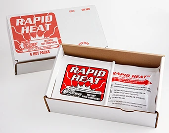 The Rapid Deployment Rapid Heat™ heat packs feature a unique design that provides easy activation. No more bag bashing! Heat Wave® heat packs ship 24 per case in sturdy 4 inner boxes of 6 to avoid shipping damage.