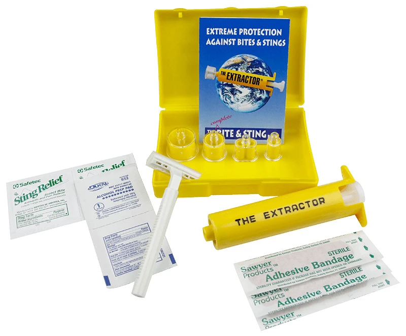 Use the Snake Bite Kit to effectively treat snake bites. Kit can also be used for wasp, hornet and bee stings. Compact kit comes complete with extractor pump, razor, four sizes of suction cups, sting care topical relief, bandaids and alcohol prep pads.